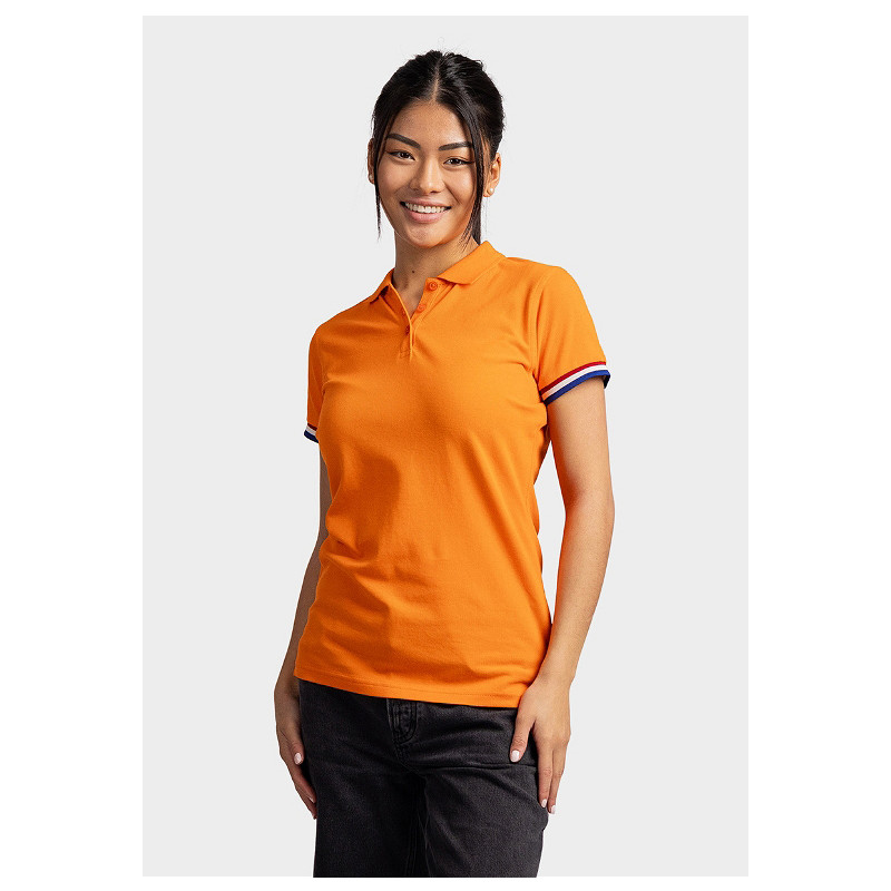 Lemon & Soda piqué dames poloshirt met korte mouwen. De polo heeft een mooi vallende pasvorm en is verkrijgbaar in orange met de Nederlandse vlag bij de mouw boord.