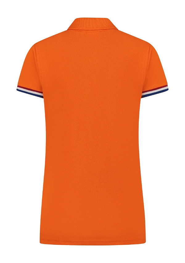 Lemon & Soda piqué dames poloshirt met korte mouwen. De polo heeft een mooi vallende pasvorm en is verkrijgbaar in orange met de Nederlandse vlag bij de mouw boord.